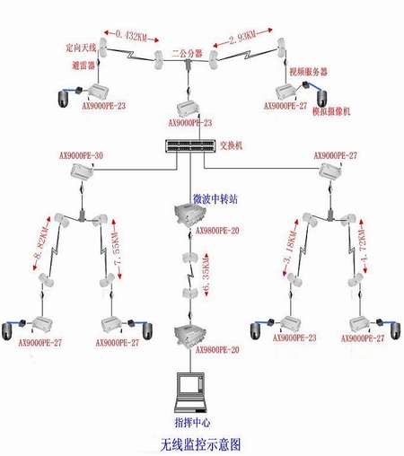 圖像采集處理部分包括模擬攝像機(jī)、全方位云臺(tái)、網(wǎng)絡(luò)視頻服務(wù)器等;信號(hào)傳輸部分包括兼容802.11a標(biāo)準(zhǔn)的電信級(jí)無(wú)線網(wǎng)橋AX9800系列產(chǎn)品、高增益天線、避雷器、高頻饋線。分控中心無(wú)線基站也選用艾克賽爾兼容802.11a標(biāo)準(zhǔn)的電信級(jí)無(wú)線網(wǎng)橋AX9820PE系列產(chǎn)品,配合高增益定向天線或扇區(qū)天線,匯聚接收其覆蓋范圍內(nèi)的各監(jiān)控點(diǎn)圖像;分控中心通過(guò)光纖與監(jiān)控總部網(wǎng)絡(luò)相連。