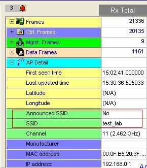 雖然禁用了SSID廣播,但是我們?nèi)匀豢梢酝ㄟ^偵聽無線數(shù)據(jù)包“透視”無線網(wǎng)絡(luò)查找SSID,Airmagnet Laptop就是這樣一款專業(yè)的無線網(wǎng)測試軟件,禁用SSID廣播這種小伎倆根本瞞不過它的法眼(圖一),Annouced SSID(通告SSID):NO,SSID:test_lab。Airmagnet快速準(zhǔn)確的獲得了我們需要的信息,而且告訴我們它原本是不廣播SSID的,來看看此功能是如何實(shí)現(xiàn)的。