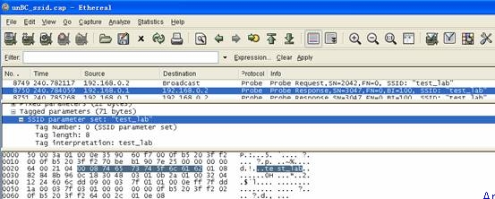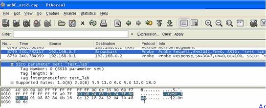 對于廣播SSID的AP,PC能夠從“查看無線網(wǎng)絡(luò)”看到SSID,點(diǎn)擊想連接的SSID實(shí)際上就是在發(fā)送探測請求,或者叫連接請求,AP“應(yīng)答”,確認(rèn)身份,建立連接。不廣播SSID的連接過程就稍微的復(fù)雜一些了,因?yàn)锳P不廣播SSID,PC是無法知道要向哪個信道去發(fā)送連接請求的,所以這時候PC會向全部13個信道發(fā)送探測請求,直到收到AP的應(yīng)答,然后就能進(jìn)行后面的連接過程了。關(guān)鍵就在于此!我們來看一下NO.8749這個Probe request探測請求幀都包括什么(圖五),正如我們所料,這里面SSID parameter set:”test_lab”這個參數(shù)——“誰是test_lab?”