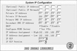 隨后我們可以自行設定無線路由器的ESSID值,默認為WLAN。所設定的ESSID值必須牢牢記住,它就好比是一道檢驗密碼。所有的無線網卡必須使用相同的ESSID值才能與無線路由器通訊。如果無線路由器還需要連接100/10M有線網絡,那么我們還需要進行進一步設置。在主界面選擇CONFIGURATION→Advanced→IP/DHCP,出現(xiàn)System IP Configuration 配置界面。此時我們所要做的僅僅是將當DHCP一項設為Enable,一旦用戶的有線網卡和無線網卡的TCP/IP屬性設置成自動獲得IP地址,就能由無線路由器處得到一個IP地址了(圖2)。