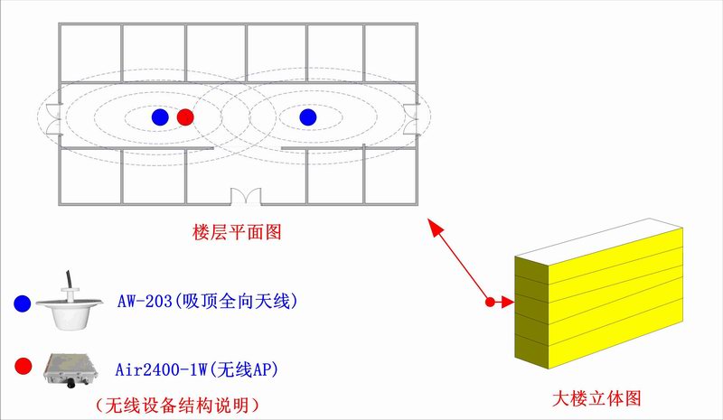 根據(jù)需求,我們設(shè)計采用每層安裝一套大功率電信級無線AP,使用功分器的形式,分接2個吸頂全向天線,分別安裝在走廊的中間位置。采用無線方式,架設(shè)方便,運(yùn)行、維護(hù)成本低,周期短。本方案的設(shè)計綜合考慮經(jīng)濟(jì)性、施工可行性等多方面因素,力求做到最優(yōu)。
