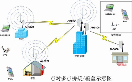 從上圖可以看出,我們需要在附近的最高點做為網(wǎng)絡(luò)的發(fā)射基地,由于最高點本身沒有網(wǎng)絡(luò)可以到,因此,需要在2KM外(網(wǎng)通機房)的地方,把網(wǎng)絡(luò)信號傳輸過來,使用的設(shè)備為我公司的Air5800設(shè)備,該設(shè)備工作在5.8G頻段,帶寬為54M。高樓橋接到網(wǎng)絡(luò)后,再通過Air5824雙頻無線網(wǎng)橋,傳輸?shù)脚赃叺慕ㄖ铮瑢崿F(xiàn)就地覆蓋,同時在高樓上面再做相應(yīng)的覆蓋,Air5824系列網(wǎng)橋為雙射頻輸出,一路為5.8G,一路為2.4G,其中2.4G輸出為1W的發(fā)射功率,可以實現(xiàn)室外無阻擋半徑1000米覆蓋。系統(tǒng)網(wǎng)絡(luò)建成后,目前發(fā)展用戶已達80多戶,為用戶解決網(wǎng)絡(luò)帶寬的同時,獲取了較高的利潤。更詳細的信息,請來電咨詢大宏科技公司。