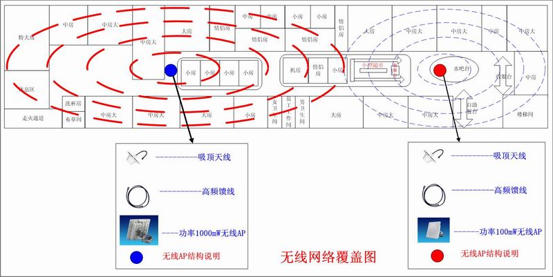厚街某量販式KTV,共3層樓,其中2,3樓為包房,1樓為收銀及餐廳,在每個包房放有一臺電腦供客戶上網(wǎng)娛樂,因為房間分布緊密,而且不輕易布線,因此客戶想用無線的方式來解決,通過大宏公司技術人員對現(xiàn)場的勘查及測試,設計了在2樓3樓各安裝一套發(fā)射功率為1000mW的Air2400-1W及發(fā)射功率為100mW的Air2400-E無線AP,并接上增益為3dBi的吸頂全向天線,該天線美觀大方,而且性能穩(wěn)定.經(jīng)過一天的施工,該項目成功完成,而且每個房間的信號強度保證在80%以上.相當穩(wěn)定!
