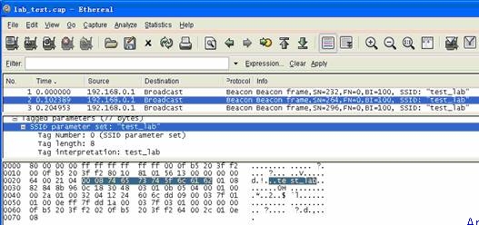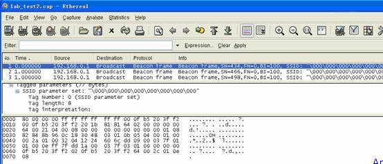 雖然禁用了SSID廣播,但是我們?nèi)匀豢梢酝ㄟ^偵聽無線數(shù)據(jù)包“透視”無線網(wǎng)絡(luò)查找SSID,Airmagnet Laptop就是這樣一款專業(yè)的無線網(wǎng)測試軟件,禁用SSID廣播這種小伎倆根本瞞不過它的法眼(圖一),Annouced SSID(通告SSID):NO,SSID:test_lab。Airmagnet快速準(zhǔn)確的獲得了我們需要的信息,而且告訴我們它原本是不廣播SSID的,來看看此功能是如何實(shí)現(xiàn)的。